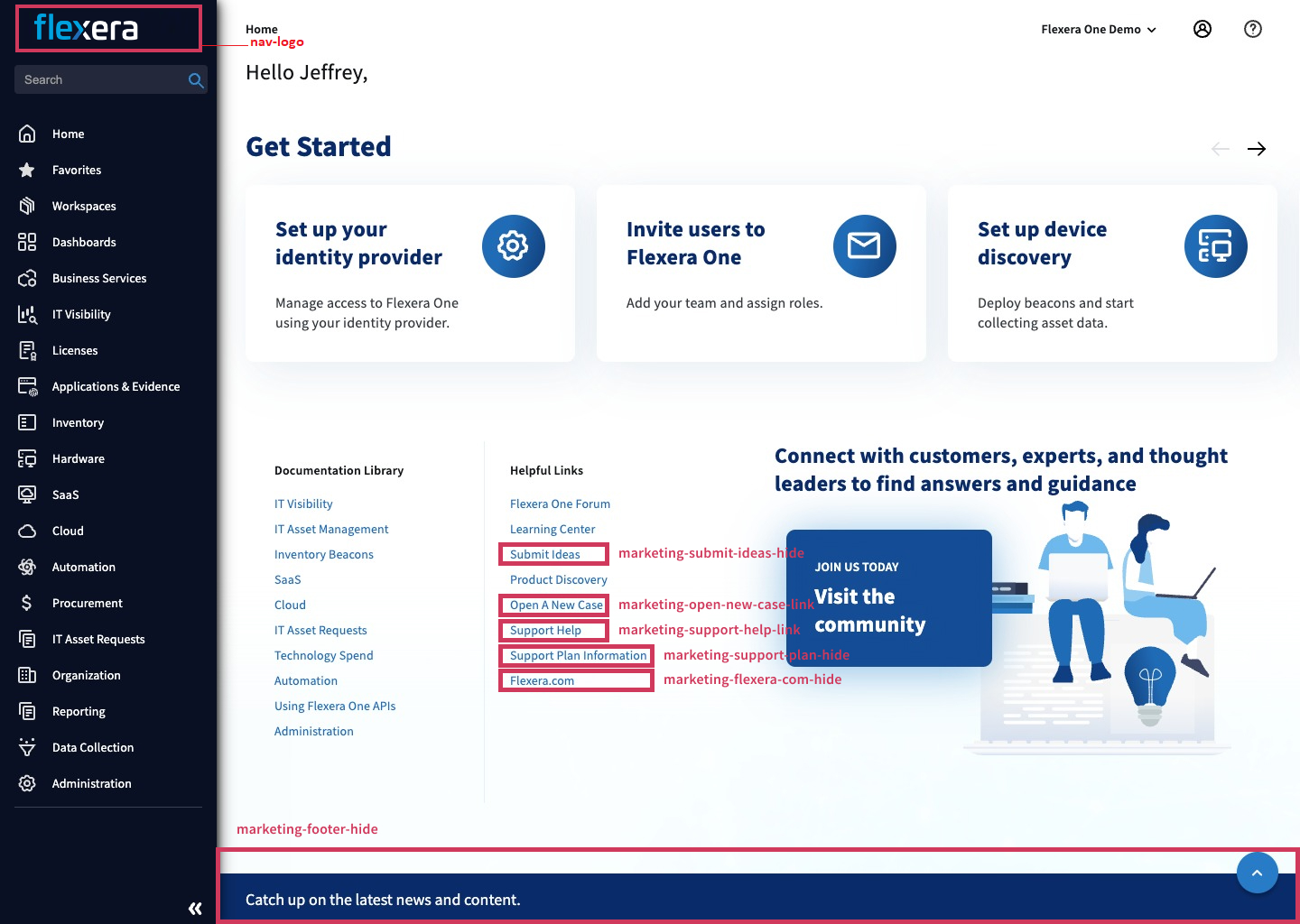See Customization IDs Visual Reference for screenshots that show you the specific locations where each customization ID resides in Flexera One.