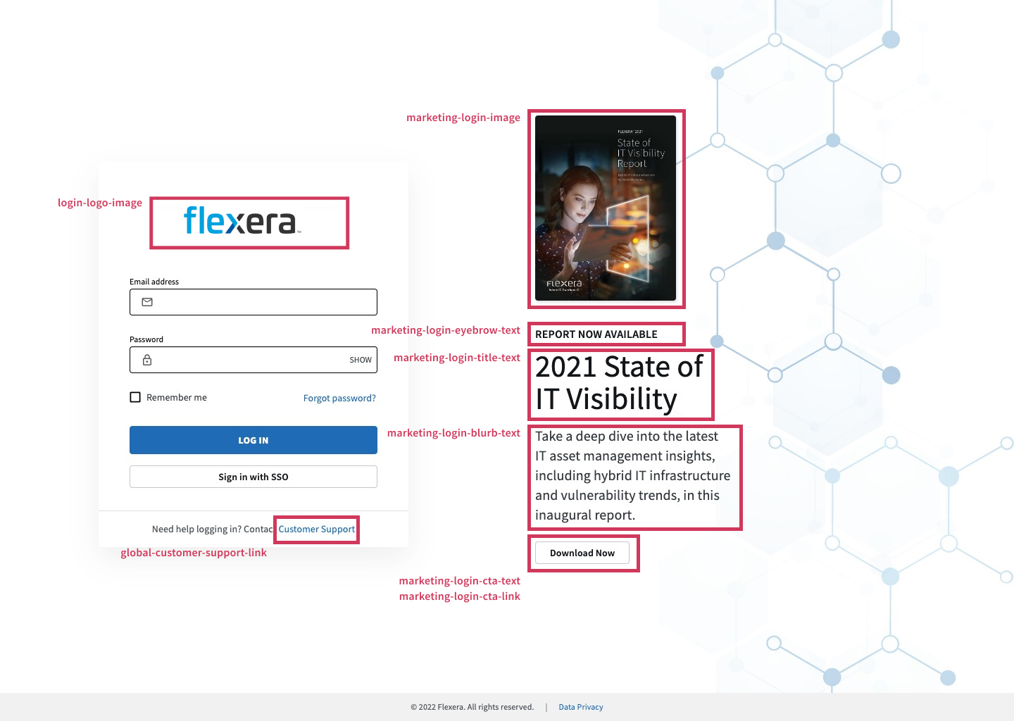 marketing-login-imageURLThe web address of the image resource file location to use in place of the Flexera marketing section on the login page. For visual reference of this item’s location, see Login Page.Recommended pixel size—At most 300 horizontal pixels. At most 300 vertical pixels.
