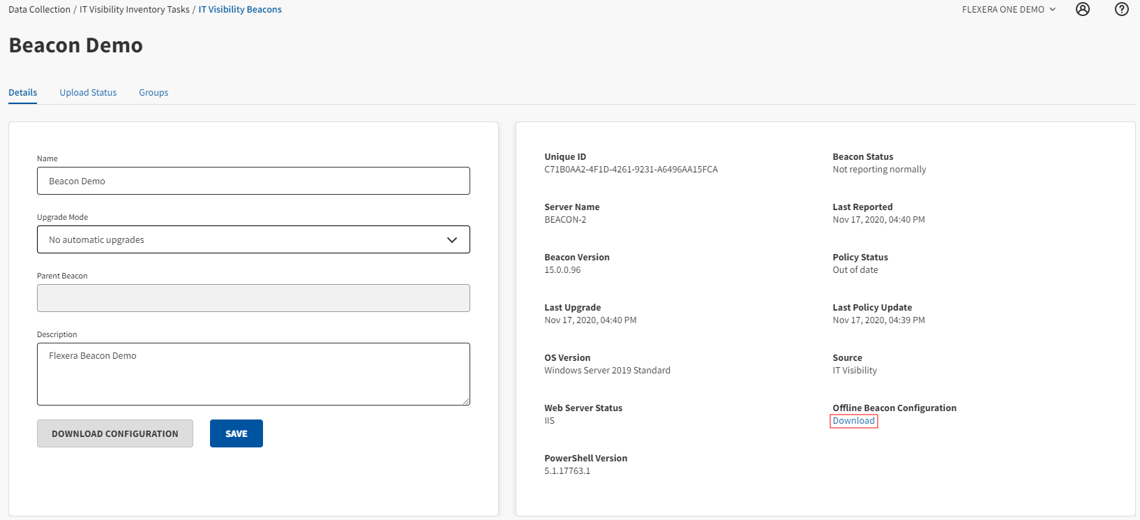 Click download the offline beacon configuration by clicking the Download link.