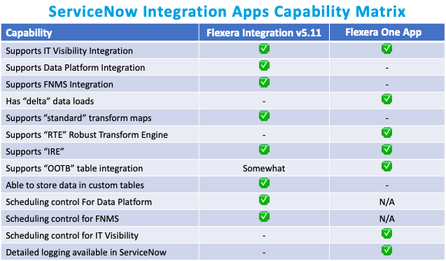 Comparing the existing Flexera Integration app with the new Flexera One app, the matrix below shows the key differences between these apps.