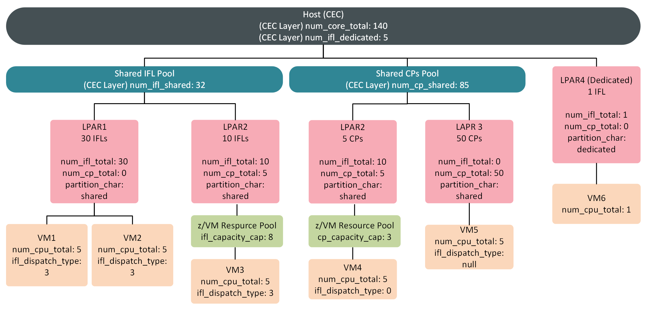 Under host, the shared pool sits at the top level of the virtual hierarchy, which is divided up between CPs and IFLs. LPARs come under CPs and IFLs respective of what core type they are using, followed by the hypervisor (if a hypervisor is in use) and lastly the VM.