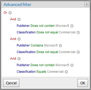 • For example, to prepare for a Microsoft audit, you may need to focus on commercial applications published by Microsoft. For the moment, we need to hide these desirable applications while we focus on moving away all the others. Since the advanced filter does not allow for starting a filter with "Not", we need a more complex filter specification to reveal everything except the Microsoft commercial applications: