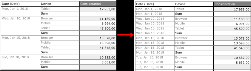The following image shows the difference between exported data with merged and unmerged cells in the Date column.