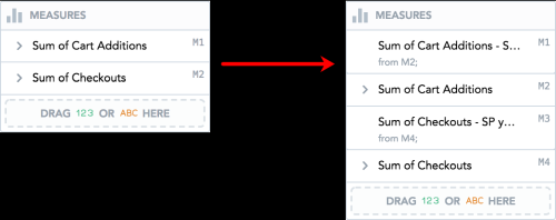 They have SP year ago or previous period added to their name. Click the name to rename them. For details, see Renaming Measures.