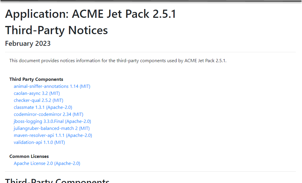 The Third-Party Notices report provides the attributions and license text for each third-party or commercial component in the selected bucket. The report is in HTML (.html) format.