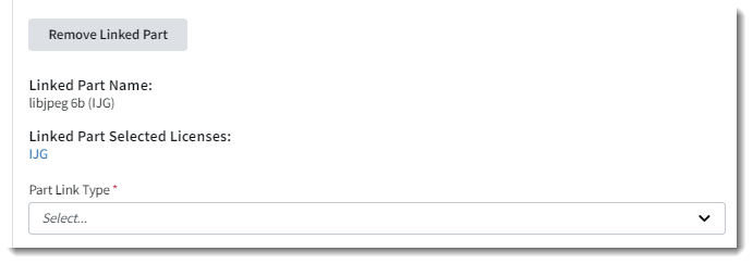 - Click Select. The slideout closes, and the name and licenses of the selected part are displayed in the Linked Part Name and Linked Part Selected Licenses fields on the Create SBOM Part or Edit SBOM Part slideout. (These fields along with Part Link Type field are available only after you have selected a part on the Select SBOM Part slideout.)